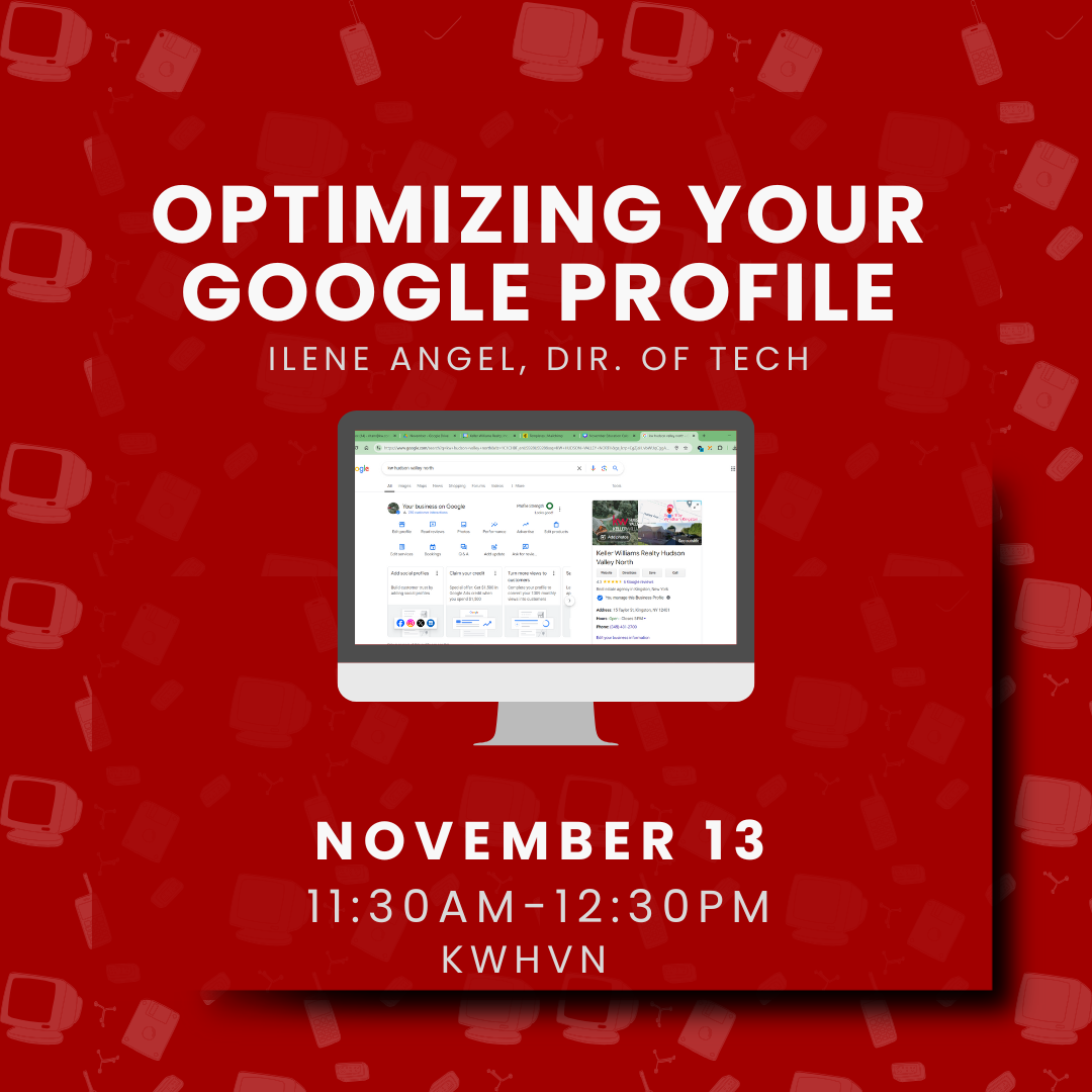 DESCRIPTION: Learn how to setup your Google profile, the right way, to get seen online during this interactive class with Ilene! Google is the largest search portal in the country, and people use it every day to search for local real estate agents. Make sure that your name pops up in your target market during this class!